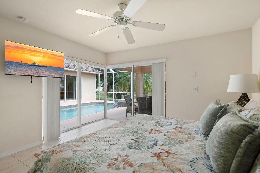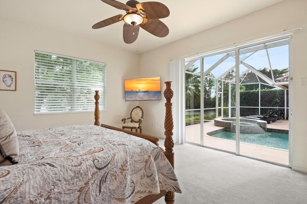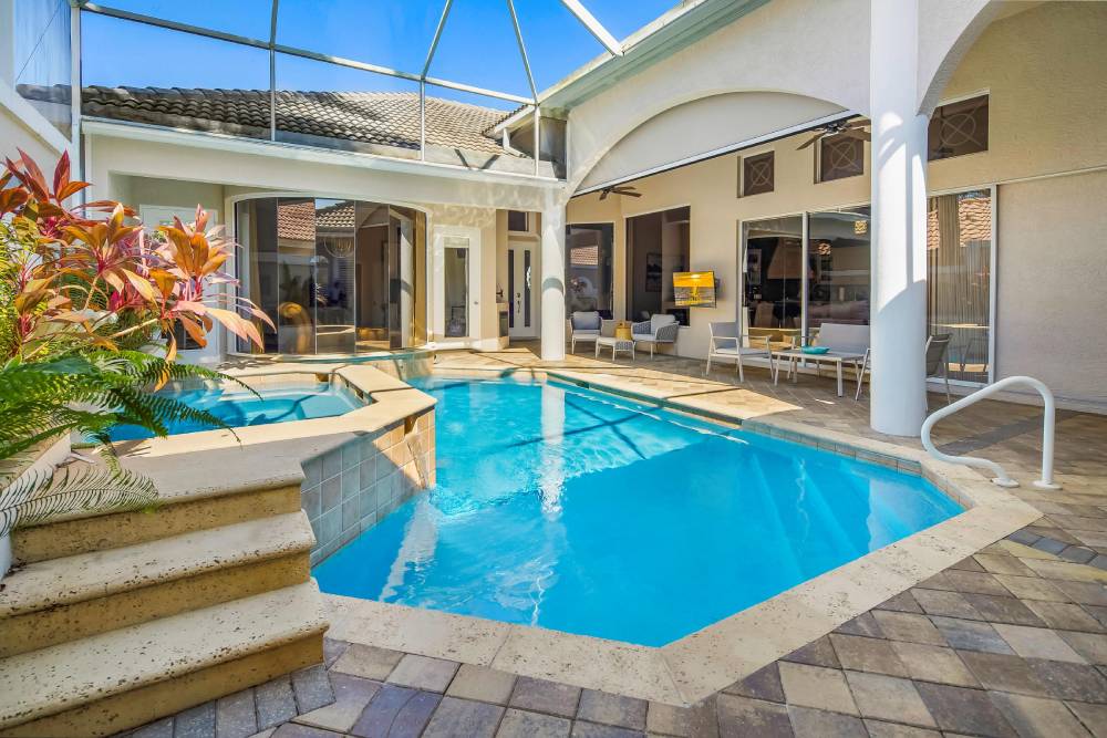 The private, screened-in lanai features a large heated pool, outdoor dining area, and a tranquil backyard with lake views. Whether you’re enjoying coffee by the pool in the morning or grilling dinner al fresco, the outdoor space is a true highlight.